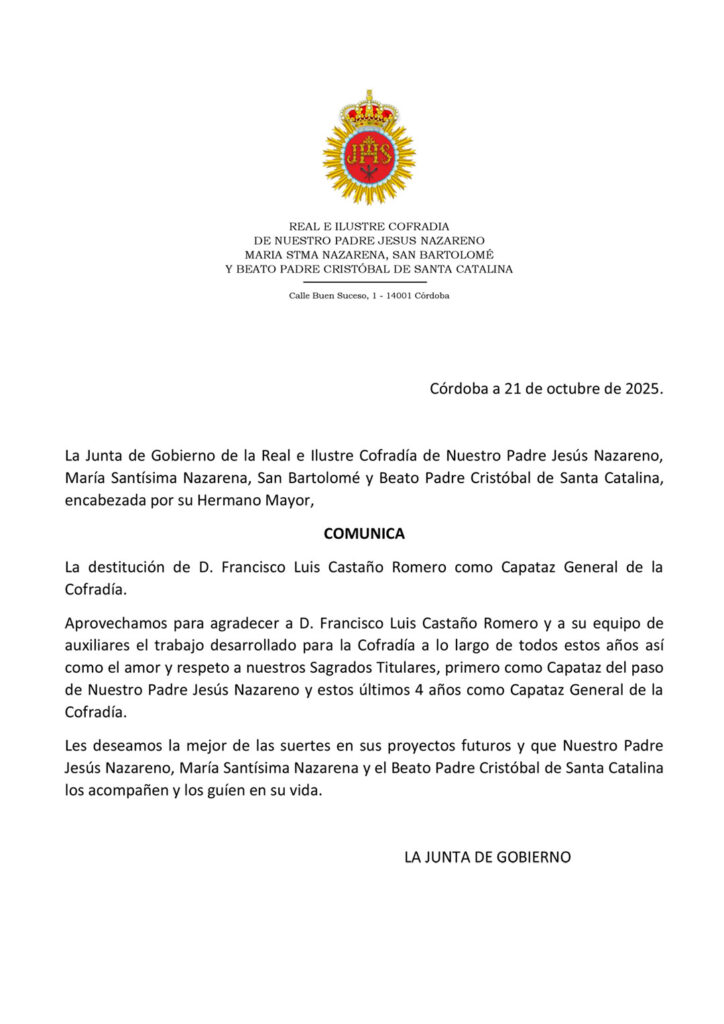Francisco Luis Castaño, destituido como capataz general de la Cofradía del Nazareno de Córdoba
