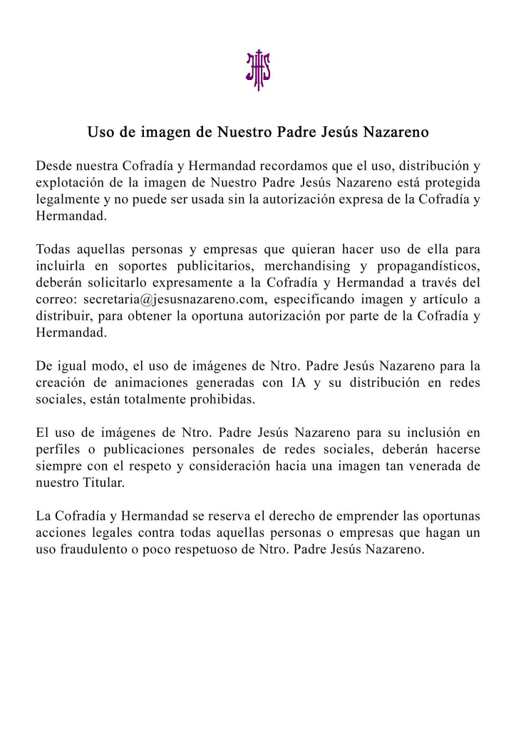 La entidad insiste en que ningún uso puede realizarse sin el permiso previo correspondiente, amparado en el marco normativo que tutela la iconografía del Nazareno. En este sentido, se detalla que tanto particulares como empresas que pretendan emplear la representación del Señor en materiales publicitarios, productos de merchandising o con fines propagandísticos deberán tramitar una solicitud formal.