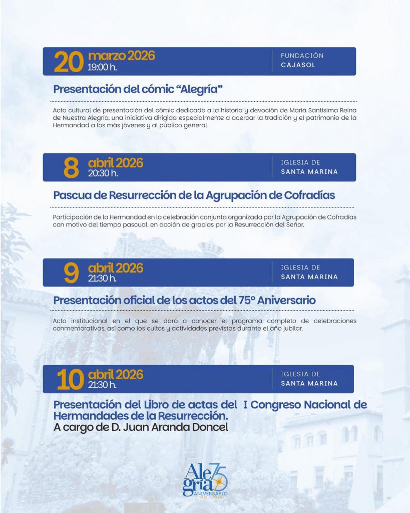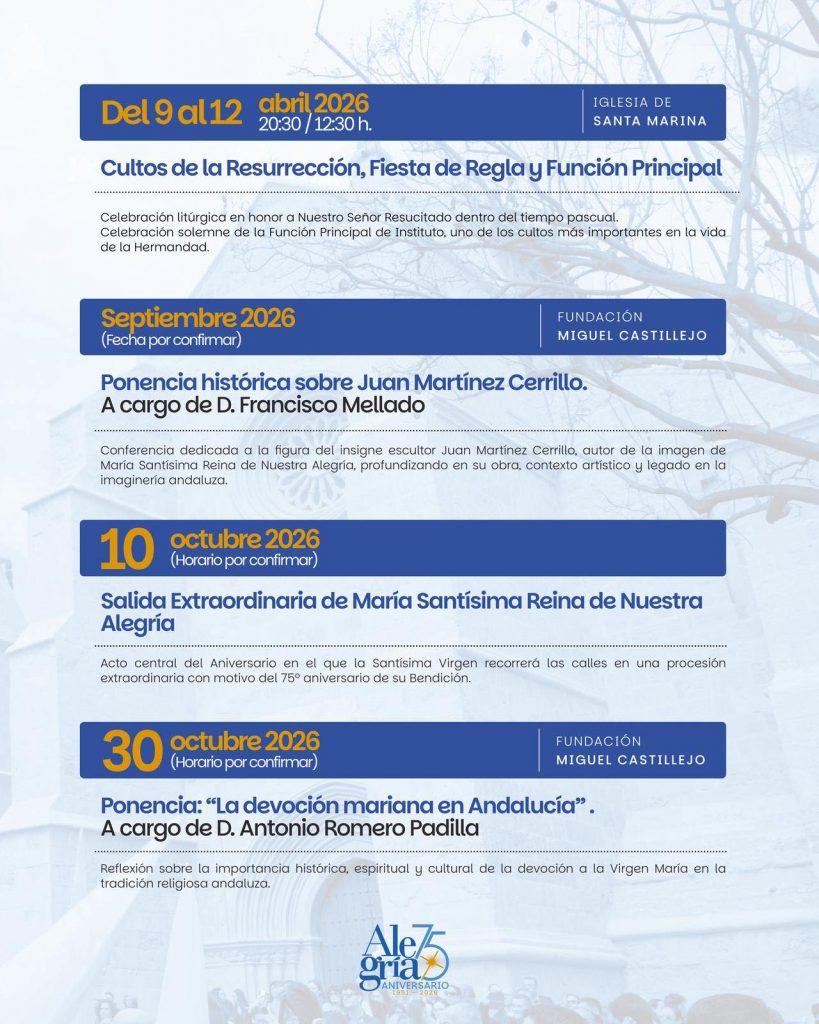 Con estas propuestas, la Hermandad del Resucitado perfila un año de especial intensidad, en el que la celebración del 75 aniversario de la Virgen de la Alegría se proyecta como un acontecimiento de referencia para la vida cofrade cordobesa.