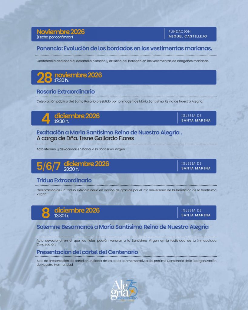El programa extraordinario del aniversario no se limita a esta salida. La corporación ha diseñado un calendario amplio que se desarrollará durante varias semanas y que incluye actos de diversa naturaleza. Entre ellos figura la procesión extraordinaria de Santa María de la Merced el 17 de octubre, así como el Rosario extraordinario de la Virgen de la Alegría el 28 de noviembre, ambos integrados en la agenda conmemorativa.