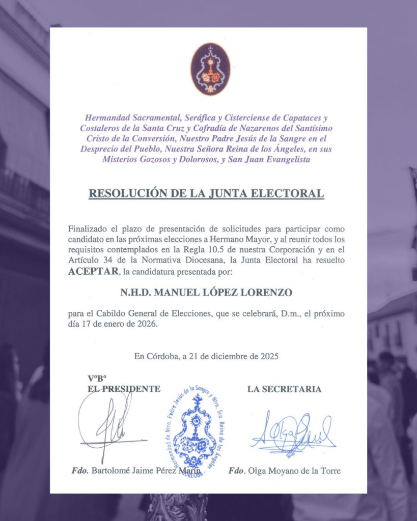 La Hermandad del Cister de Córdoba ha dado un paso decisivo hacia su próximo proceso electoral con la confirmación de que D. Manuel López Lorenzo, actual Hermano Mayor, será el único candidato que concurrirá al Cabildo General de Elecciones previsto para el 17 de enero de 2026.