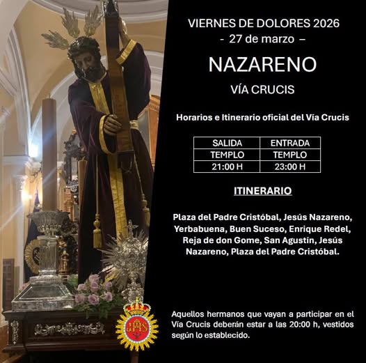 El 27 de marzo, coincidiendo con el Viernes de Dolores la feligresía donde reside la Hermandad del Nazareno de Córodba volverá a vivir uno de los actos más esperados de la Cuaresma: el piadoso ejercicio del Vía Crucis presidido por la sagrada imagen de Nuestro Padre Jesús Nazareno. Esta fecha, que marca el umbral inmediato de la Semana Santa, conserva un profundo arraigo en numerosas localidades andaluzas y españolas, donde la figura del Nazareno se convierte en símbolo de recogimiento, penitencia y preparación espiritual.