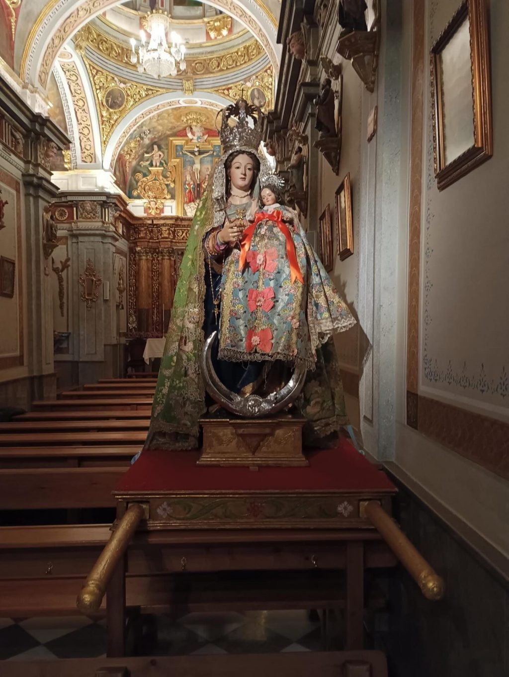 Nuestra Señora del Rosario ya se encuentra vestida para la ocasión por su vestidor, Don Jesús Lizana, en una estampa que resalta por su delicadeza y simbolismo. La elección de tejidos claros y detalles luminosos subraya el carácter propio de esta celebración, que conmemora la presentación del Niño Jesús en el templo y la purificación de la Virgen María. La imagen, preparada con esmero, será uno de los grandes focos de devoción durante la procesión de las velas.