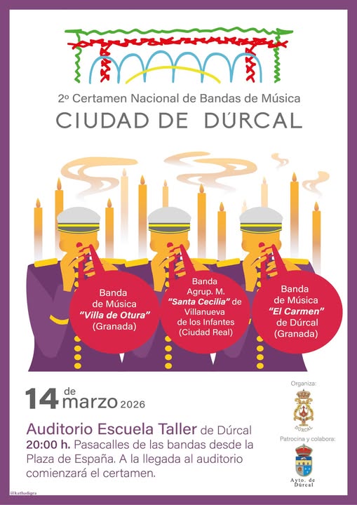 El evento, organizado por la Banda de Música “El Carmen” de Dúrcal en colaboración con el Ayuntamiento de la localidad, reunirá este año a tres formaciones de gran nivel y trayectoria: la Banda de Música “Villa de Otura” (Granada), la Agrupación Musical “Santa Cecilia” de Villanueva de los Infantes (Ciudad Real) y la propia banda anfitriona, que ejercerá de cierre y anfitriona del certamen.