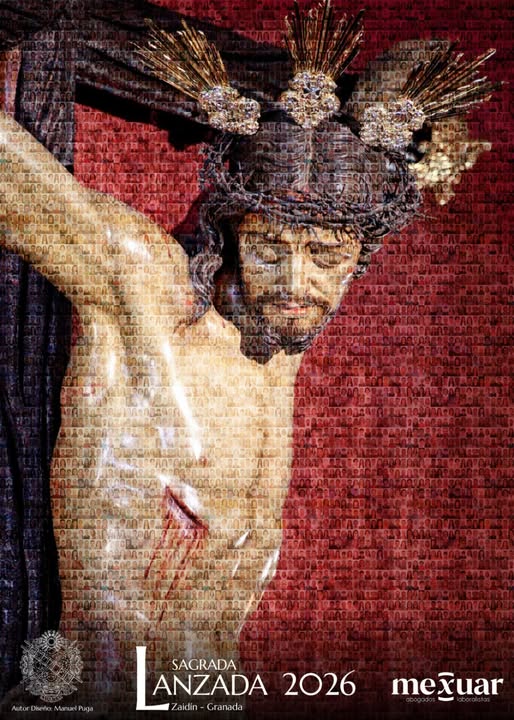 El cartel es una obra asistencial y participativa, concebida como un collage formado por las fotografías de hermanos y devotos que, en su conjunto, dan forma a la imagen de Nuestro Señor Jesucristo en su Sagrada Lanzada. La fotografía base sobre la que se compone la obra es de Raúl Gutiérrez, mientras que la composición y el diseño final han sido realizados por Manuel Puga. La presentación ha corrido a cargo de Emilia Cayuela.