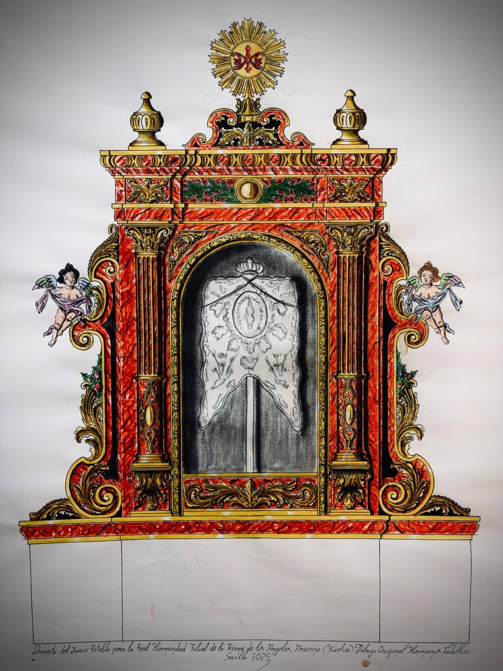 El diseño y ejecución del nuevo altar ha sido confiado al Taller de los Hermanos Caballero, responsables del proyecto artístico y de los trabajos de carpintería y talla, que afrontan esta obra con el máximo respeto a la tradición, al espacio arquitectónico y a la significación devocional del Simpecado. Destaca que estará realizado en madera de cedro y el diseño se inspira en los retablos neoclásicos existentes en la Iglesia del Carmen, integrándose armónicamente en el templo y apostando por una estética donde predominan los tonos rojizos y dorados, colores de profundo simbolismo vinculados al Simpecado. El proceso de dorado y marmolizado será realizado por el Taller de los Hermanos González.