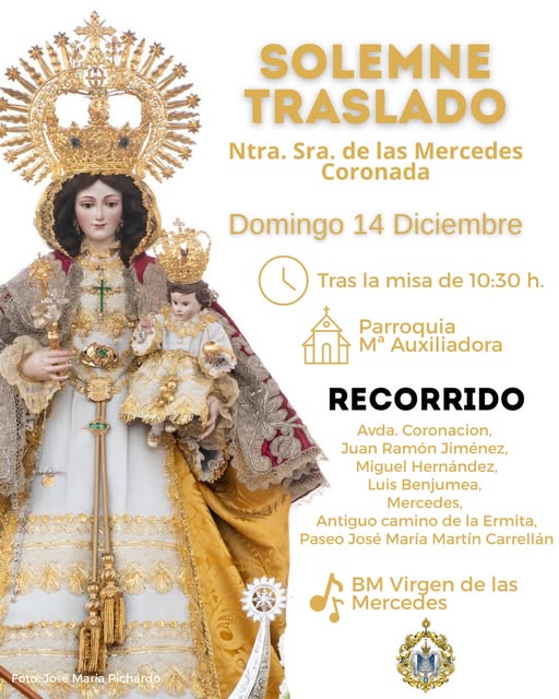 Este domingo 14 de diciembre, la mañana se abrirá con campanas y plegarias en Bollullos par del Condado. Tras la misa de las 10:30 h. en la Parroquia de María Auxiliadora, la Santísima Virgen de las Mercedes Coronada emprenderá su camino de vuelta a la Ermita, en un traslado, tras los cultos y procesión por la Inmaculada Concepción, .que se convierte cada año en símbolo de fe y memoria compartida.