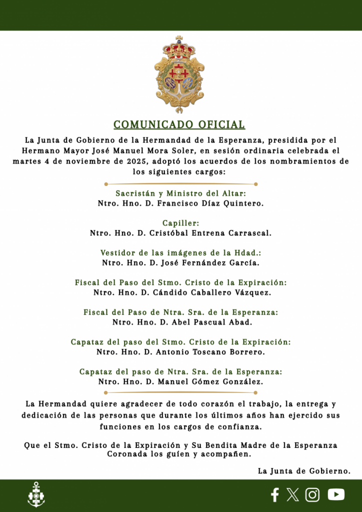HUELVA Nombramiento de cargos en la Hermandad de la Esperanza de Huelva admin noviembre 6, 2025 1 min de lectura Huelva, a 6 de noviembre de 2025 Tags: CARGOS HERMANDAD DE LA ESPERANZA HUELVA Post navigation Anterior Presentado el nuevo Guion Corporativo de la Hermandad de Emigrantes de HuelvaSiguiente Inaugurada la exposición “Ajuar de la Virgen de la Asunción” en Estepa Deja una respuesta Cancelar la respuestaTu dirección de correo electrónico no será publicada. Los campos obligatorios están marcados con *Comentario * Nombre * Correo electrónico * Web Guarda mi nombre, correo electrónico y web en este navegador para la próxima vez que comente. Δ Más historias 2 min de lectura HUELVA La Hermandad Matriz de Almonte actualiza sus Reglas al Estatuto Marco de la Diócesis de Huelva noviembre 14, 2025 admin 4 min de lectura HUELVA La imagen de San Antonio de Padua de Higuera de la Sierra será restaurada por David Triguero Berjano conforme al proyecto aprobado por la Diócesis de Huelva noviembre 6, 2025 admin 1 min de lectura HUELVA SEVILLA María Stma de la Salud del Santo Ángel de Sevilla lucirá en el Rosario Vespertino del 15 de noviembre el manto de Ntra Sra de la Soledad de Huelva noviembre 4, 2025 admin