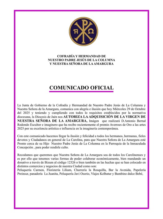 La Diócesis de Jaén autoriza a la Hermandad de la Columna de La Carolina la nueva imagen de Nuestra Señora de la Amargura