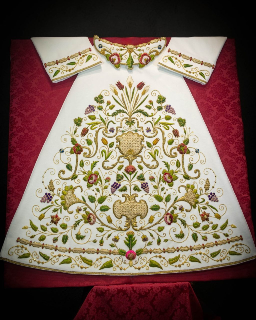 Para su ejecución se han recuperado íntegramente bordados procedentes de una dalmática italiana del siglo XVIII, cuyos elementos han sido completamente restaurados y pasados a un nuevo soporte, aprovechando en su totalidad las piezas originales.