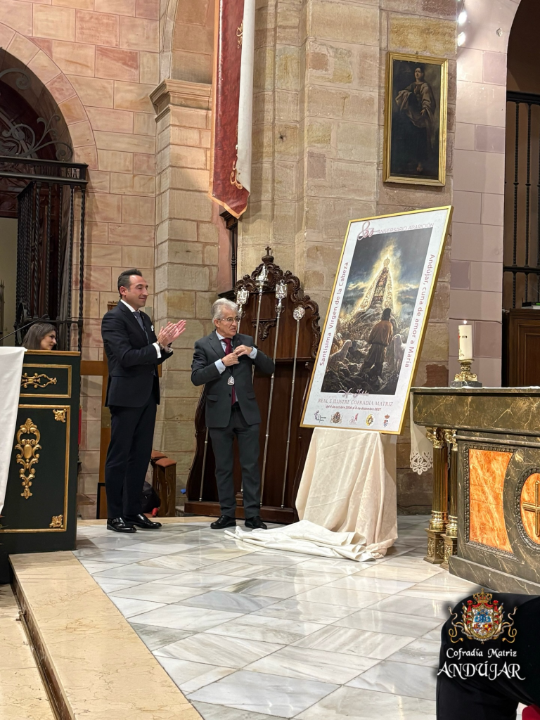 Tras el descubrimiento del lienzo y la lectura de la carta del autor, se ha dado a conocer el cartel oficial del aniversario. Han intervenido el Hermano Mayor, el Alcalde de Andújar, el Presidente de la Cofradía Matriz y el Provicario de la Diócesis de Jaén.