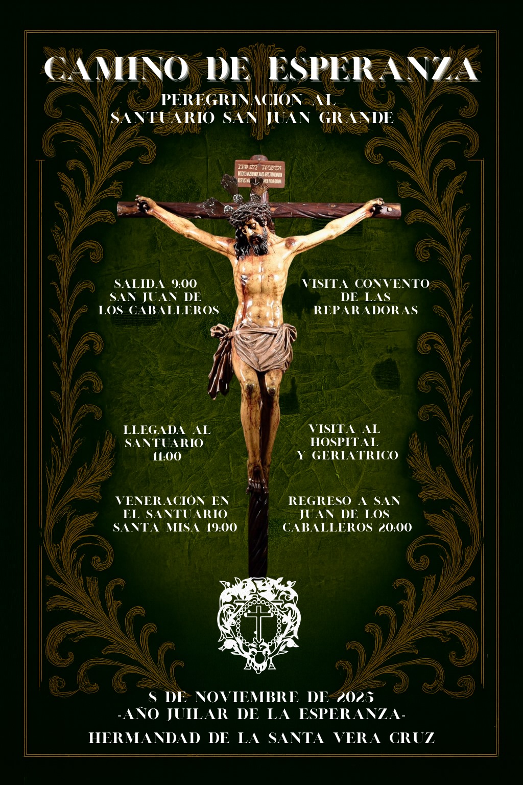 La Hermandad de la Santa Vera Cruz de Jerez celebrará este sábado 8 de noviembre de 2025 la peregrinación del Santísimo Cristo de la Esperanza al Santuario de San Juan Grande, con motivo del Año Jubilar de la Esperanza- Este traslado ya se suspendió en marzo a consecuencia del mal tiempo.