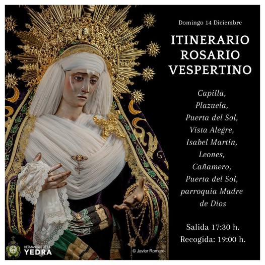 En esta jornada de domingo 14 de diciembre, el barrio de la Plazuela vivirá una jornada marcada por la emoción y el fervor popular con la salida en Rosario Vespertino de Nuestra Señora de la Esperanza Coronada. La imagen recorrerá las calles de su feligresía en un acto que combina oración, tradición y cercanía con los vecinos.