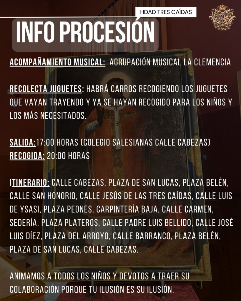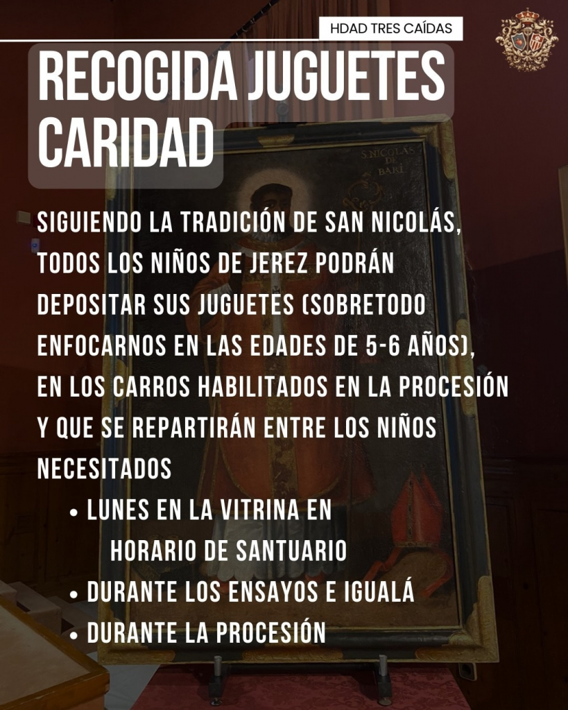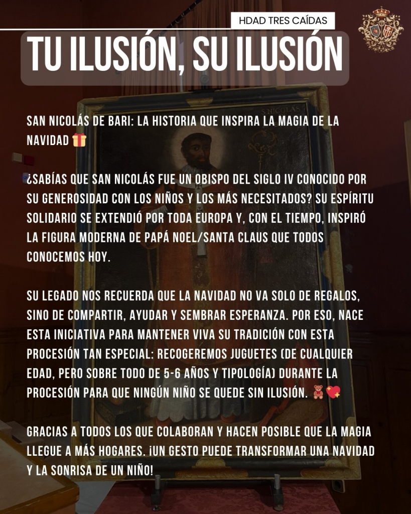 La Hermandad de las Tres Caídas de Jerez prepara para el próximo sábado 27 de diciembre una cita muy especial que une fe y solidaridad. A partir de las cinco de la tarde tendrá lugar la Procesión Solidaria en honor a San Nicolás de Bari, un acontecimiento que recorrerá las calles de la ciudad acompañado por los sones de la Agrupación Musical La Clemencia.