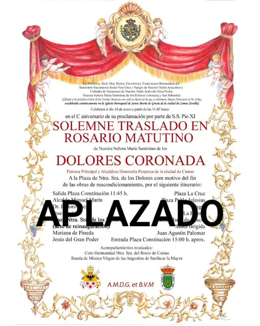 El Ayuntamiento de Camas y la Hermandad Sacramental han comunicado oficialmente el aplazamiento del acto de inauguración de la nueva Plaza Nuestra Señora de los Dolores, así como del solemne traslado de Nuestra Señora María Santísima de los Dolores Coronada, Patrona de la ciudad.