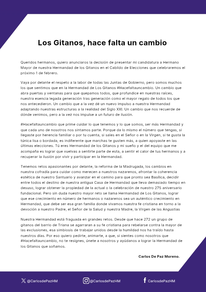 Con estos planteamientos, la candidatura de Carlos de Paz se suma a un proceso electoral que se anticipa intenso y decisivo para el futuro de los Gitanos, una hermandad que encara un momento clave en su historia reciente.