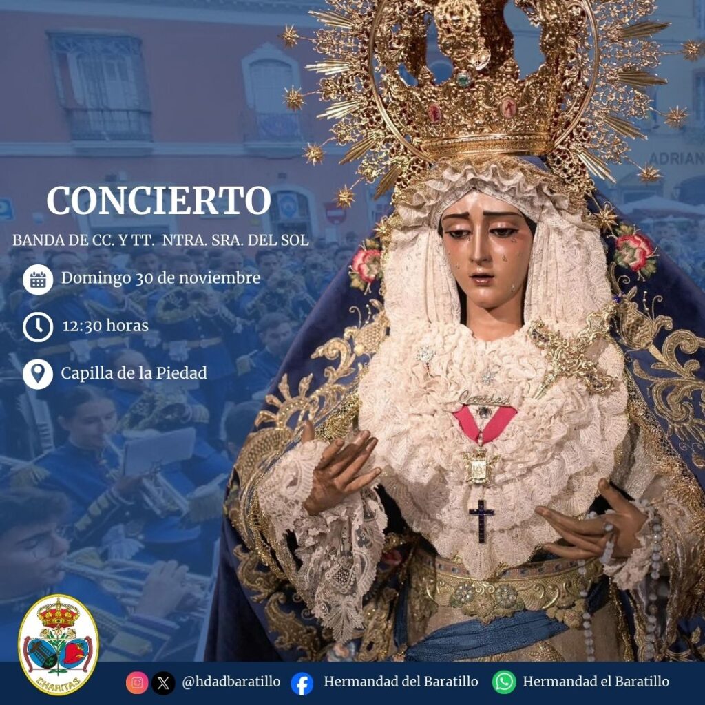 Este domingo 30 de noviembre, la Hermandad del Baratillo de Sevilla celebra en su Capilla el Solemne Besamanos en honor a María Santísima de la Caridad en su Soledad. Como viene siendo habitual, un año esta corporación contará con la participación de la Banda del Sol, que interpretará sus sones en las puertas de la Capilla.