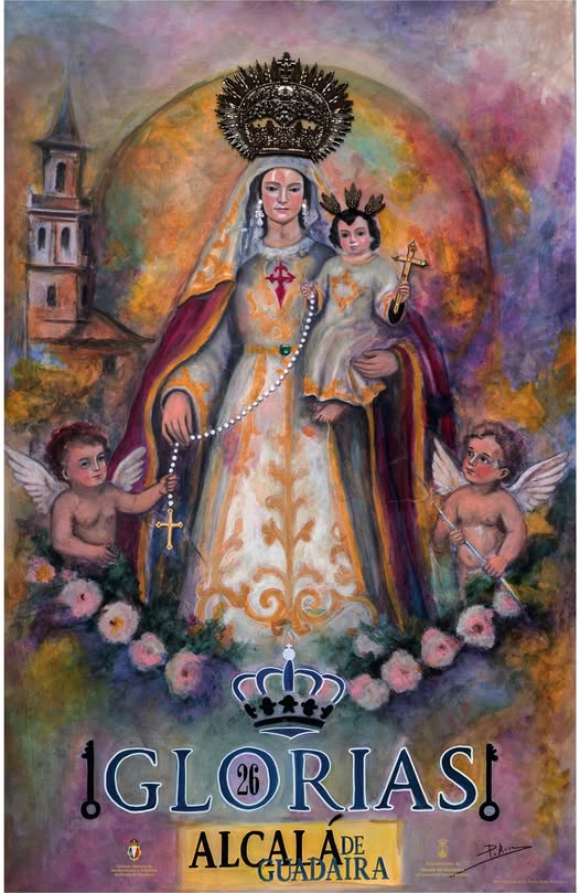 El cartel de las Glorias alcalareñas de este año nace de la mano de Pablo Rosa Rodríguez y se presenta como algo más que una imagen: es, en palabras del propio autor, “un verdadero pregón pictórico, un susurro de fe hecho color, luz y memoria”. La pintura, dedicada a la Virgen del Rosario de Santiago, Titular de la Hermandad de la Misericordia, se convierte en un puente entre siglos de devoción y el presente vivo de un pueblo que sigue mirando a su Madre con la misma emoción de siempre.