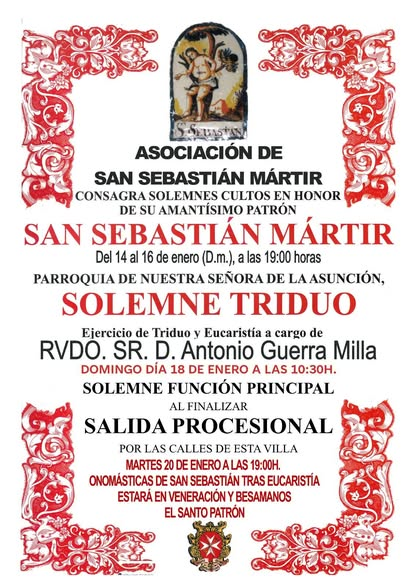 El Ayuntamiento de Lora del Río y la Asociación de San Sebastián Mártir informan que el domingo 18 de enero, a partir de las 11.30 horas y desde la Parroquia de la Asunción, tendrá lugar la salida procesional de San Sebastián, patrón de Lora del Río.
