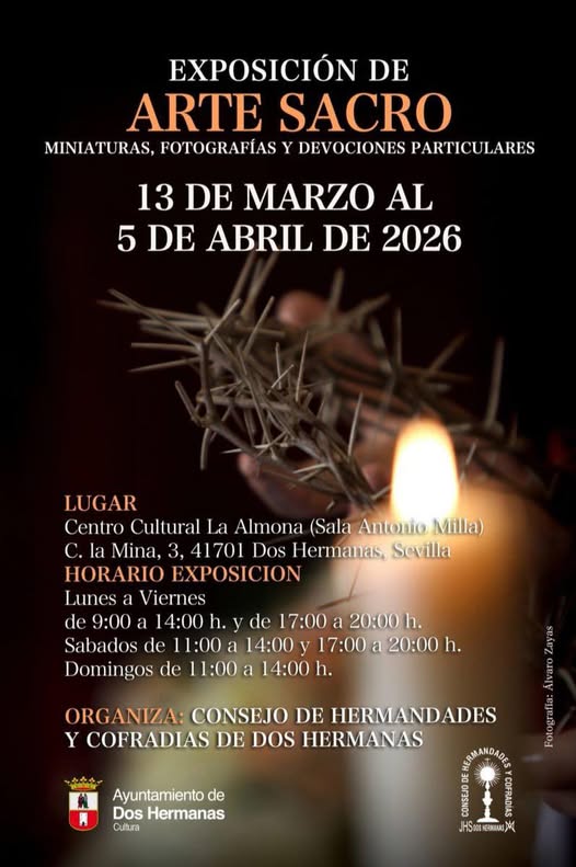 La Exposición de Arte Sacro organizada por el Consejo de Hermandades y Cofradías de Dos Hermanas, permanecerá abierta desde hoy hasta el 5 de abril de 2026 en el Centro Cultural La Almona. Este espacio, habitual sede de muestras artísticas y patrimoniales, volverá a convertirse en punto de encuentro para cofrades, curiosos y amantes del arte religioso, en una edición que promete reunir piezas de gran valor devocional y estético.