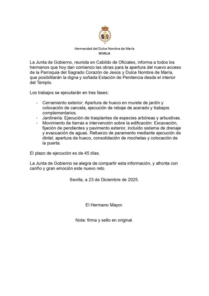 La Hermandad del Dulce Nombre de Bellavista ha informado que en la jornada de hoy han dado comienzo las obras para la apertura del nuevo acceso de la Parroquia del Sagrado Corazón de Jesús, que posibilitarán la digna y soñada Estación de Penitencia desde el interior del Templo.