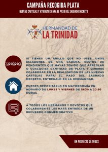 La Hermandad de la Trinidad de Sevilla pone en marcha una campaña de recogida de plata dirigida a todos los hermanos y devotos que deseen participar en la ejecución de las cartelas y los atributos de las imágenes del paso del Sagrado Decreto, actualmente en realización en el taller de orfebrería de los Hermanos Delgado, y que culminarán el diseño original de los respiraderos del paso tal como los ideara D. Antonio Dubé de Luque.