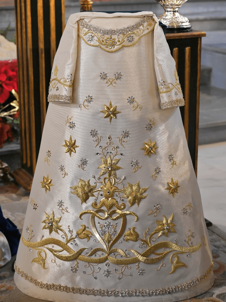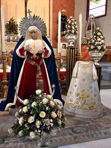 El primero de los estrenos es una saya confeccionada en tisú de plata e incrustada con cristales Swarovski, una pieza de gran delicadeza y brillo que ha sido elaborada por las artesanas Ana Bonilla y Ana Jiménez Bonilla. Ambas, junto a un hermano de la corporación, han costeado íntegramente esta obra, que destaca por su refinado trabajo textil y por la luminosidad que aportan las aplicaciones de cristal. La cinturilla que acompaña a la saya también ha sido donada por un grupo de hermanos, completando así un conjunto que realza la presencia de la Virgen en sus cultos y salidas.