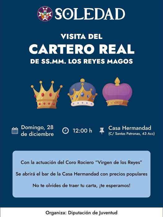 Hoy, domingo, 28 de diciembre, la Hermandad de la Soledad de San Buenaventura recibirá al Cartero Real de Sus Majestades los Reyes Magos, que llegará para escuchar sueños, recoger deseos y guardar con mimo las cartas de los pequeños soleanos.