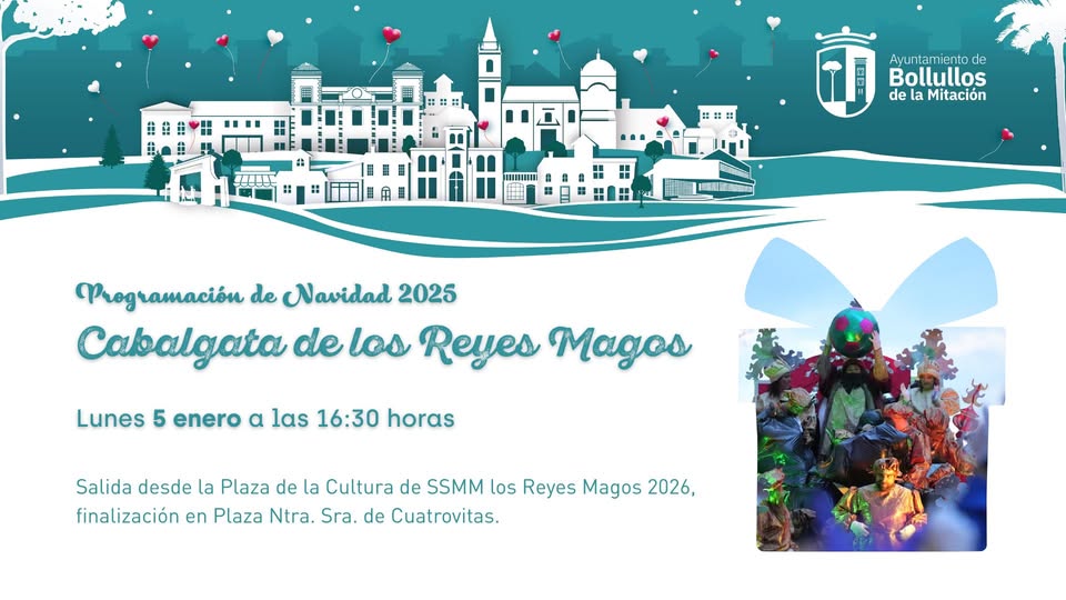 Sus majestades los Reyes Magos de Oriente llegarán a Bollullos de la Mitación para repartir magia, ilusión y regalos a todas las niñas y niños del municipio. La cabalgata, que comenzará a las 16:30 horas desde la Plaza de la Cultura, recorrerá un amplio trayecto para que la ciudadanía pueda disfrutar de la llegada de los Reyes Magos.