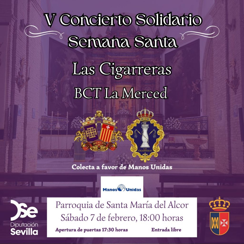 El Ayuntamiento de El Viso del Alcor celebrará este sábado 7 de febrero, a partir de las 18:00 horas (apertura de puertas a las 17:30 h), el V Concierto Solidario de Semana Santa, una cita ya consolidada en el calendario cultural y cofrade del municipio, que este año tendrá como escenario la Parroquia de Santa María del Alcor. Entrada libre. Concierto que se realiza gracias a fondos de Diputación de Sevilla.