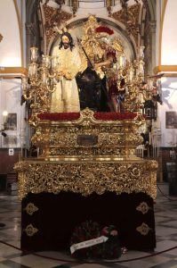La hermandad de la Redención sale de la Iglesia de Santiago a las 14:45, manteniendo su identidad de barrio y uno de los misterios más esperados del día.