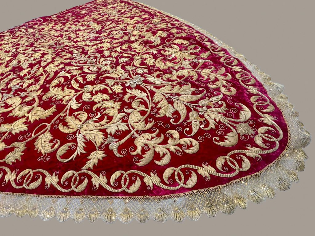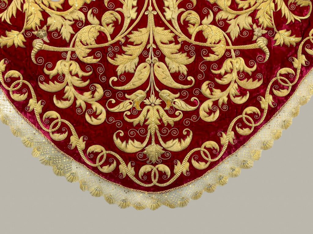 La Hermandad de la Macarena de Sevilla ha sustituido la blonda del manto rojo de 1914 de Nuestra Señora del Santo Rosario. La nueva blonda ha sido confeccionada en el taller de Alfonso Aguilar y está hecha a mano en oro fino con la técnica de encaje de bolillos.