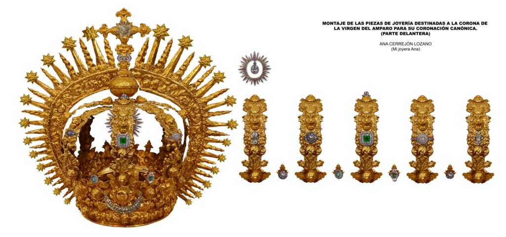 Solo una de las piezas es de nueva ejecución, la paloma de brillantes que colgará del centro de los imperiales de la corona del Niño Jesús, reproducción de otra antigua desaparecida, que será realizada igualmente por Ana Cerrejón y ha sido donada por un hermano. El resto son donativos de hermanos y devotos al tesoro de la Virgen en diferentes épocas desde el S. XVIII al XXI. En las recreaciones elaboradas por Ana Cerrejón podemos acercarnos a cómo quedarán las coronas tras todos los trabajos. La restauración dará comienzo tras la Procesión de este año 2025. Una vez concluidas serán expuestas para que puedan ser apreciadas por todos los hermanos y devotos.