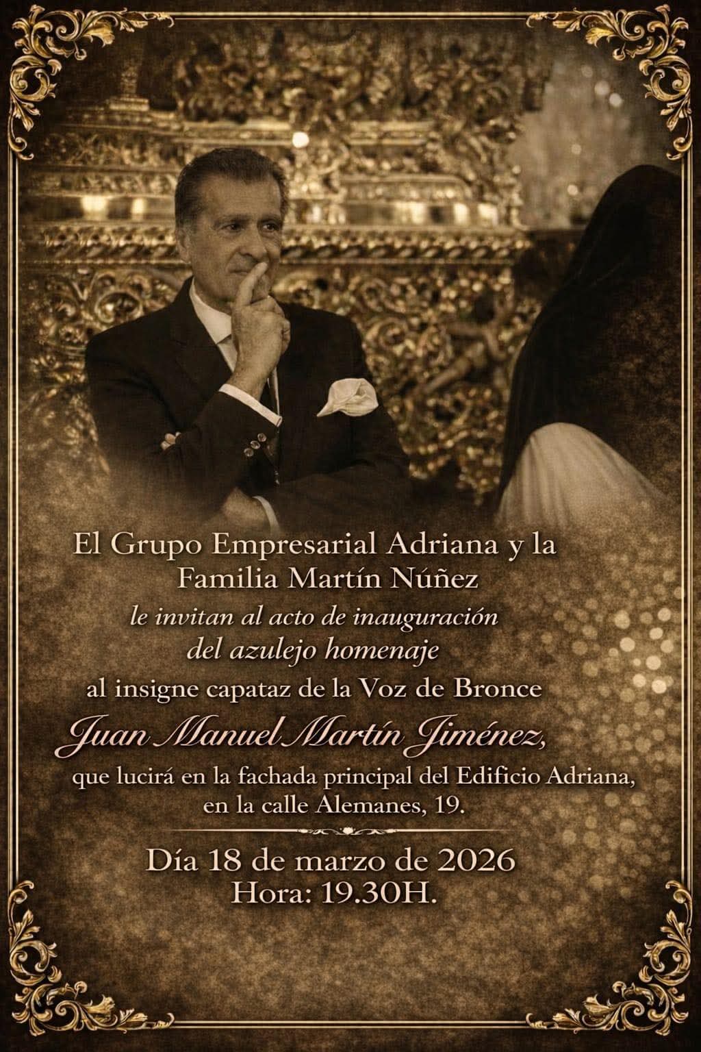 a tarde del 18 de marzo de 2026 quedará grabada en la memoria cofrade de Sevilla. A las puertas del Edificio Adriana, en plena calle Alemanes y con la Giralda como testigo, se inauguró el azulejo conmemorativo dedicado a Juan Manuel Martín Jiménez, el capataz que cambió para siempre la forma de entender el martillo en la Semana Santa hispalense. Un acto cargado de emoción, recuerdos y una presencia constante: la de papá, como lo llamaban quienes fueron su gente dentro y fuera de los pasos.