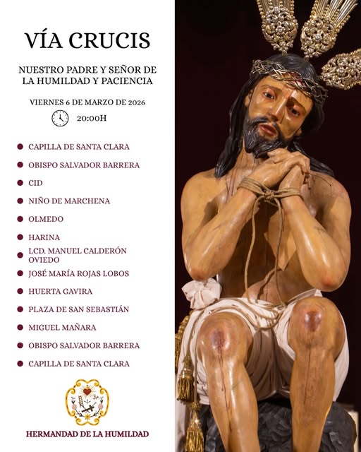 Mañana viernes 6 de marzo de 2026, a las 20:00 horas, la Hermandad de Nuestro Padre y Señor de la Humildad y Paciencia de Marchena celebrará su Solemne Vía Crucis, uno de los cultos más esperados y de mayor profundidad espiritual de la Cuaresma marchenera. La imagen del Señor, tan venerada por los fieles, recorrerá las calles del entorno de la Capilla de Santa Clara en un ambiente de silencio, oración y recogimiento, invitando a la reflexión interior y a la preparación para la inminente Semana Santa.