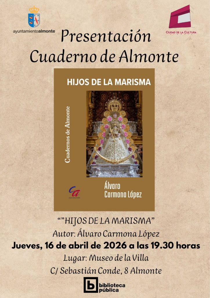 El Ayuntamiento de Almonte, en colaboración con el área de Cultura, anuncia la presentación del cuaderno “Hijos de la Marisma”, obra del poeta Álvaro Carmona López, en un acto que tendrá lugar el próximo jueves 16 de abril de 2026 a las 19:30 horas en el Museo de la Villa de Almonte. El mismo contiene fotografías de Guillermo J. Ortega.