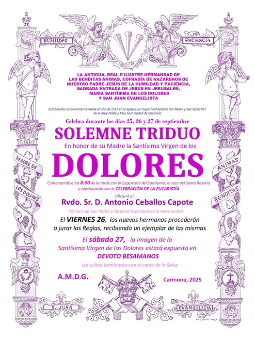 La Hdad de la Humildad de Carmona realizará cultos a su titular Ntra Sra de los Dolores durante los dias 25, 26, y 27 de Septiembre de 2025