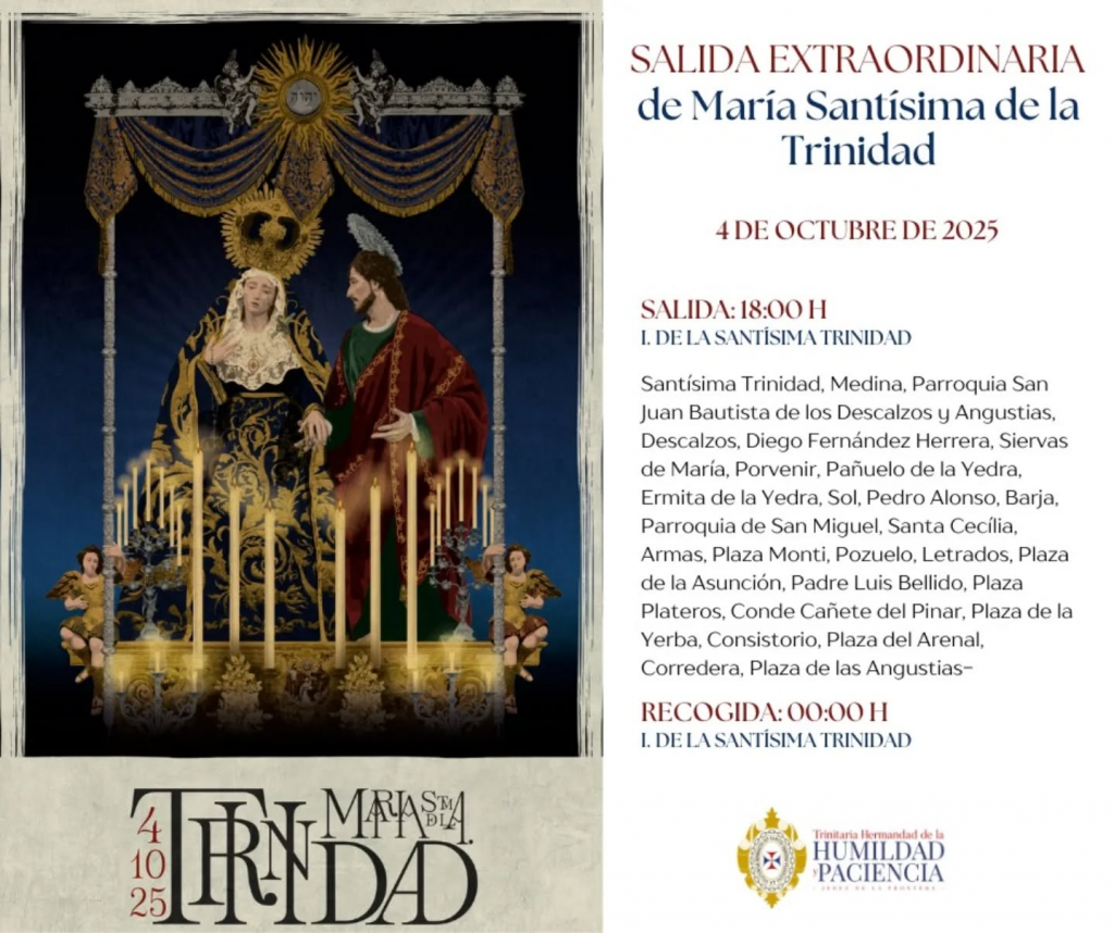 Con motivo del XXV Aniversario de la erección canónica de la Hermandad y Paciencia de Jerez el próximo 4 de octubre tendrá lugar la Salida Extraordinaria de María Santísima de la Trinidad por las calles de esta ciudad gaditana