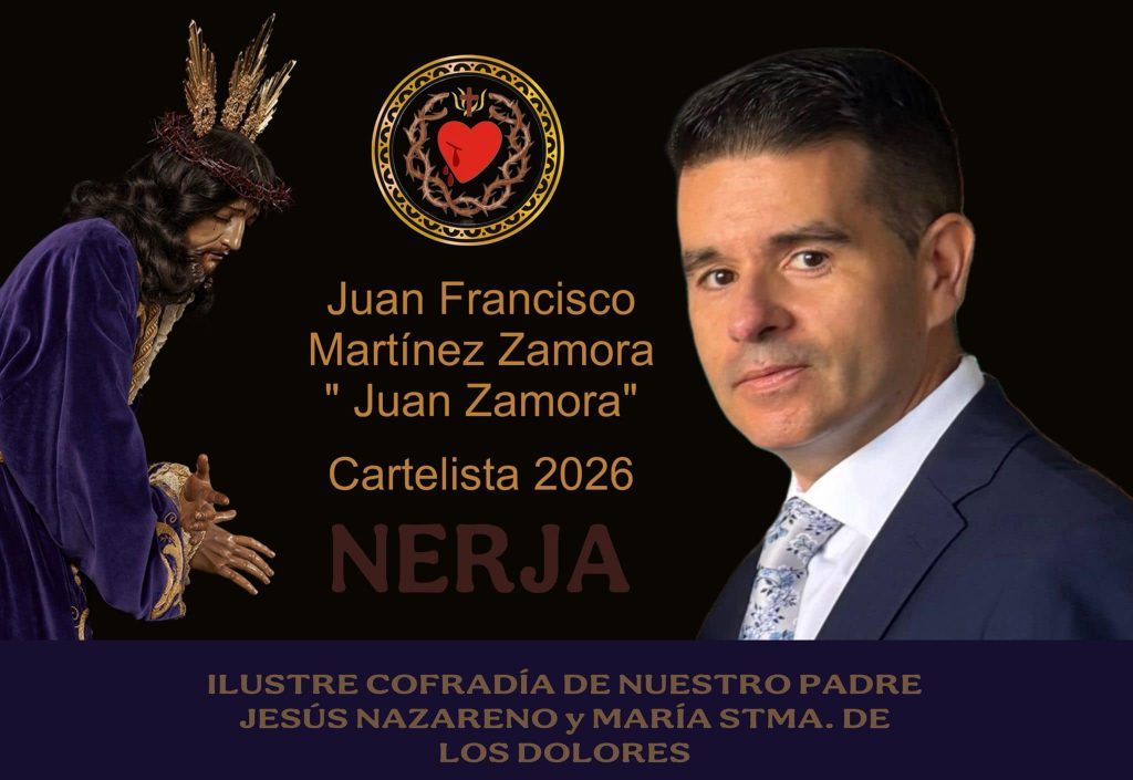La Junta de Gobierno de la Ilustre y Venerable Cofradía de Nuestro Padre Jesús Nazareno, María Santísima de los Dolores, Santo Entierro y María Santísima de la Esperanza de la localidad malagueña de Nerja ha designado a D. JUAN FRANCISCO MARTÍNEZ ZAMORA, “JUAN ZAMORA” como autor del Cartel anunciador de los Desfiles Procesionales de la Semana Santa del próximo año 2026 (que a la vez será el motivo de la siguiente Estación del Vía Crucis que esta Cofradía está realizando año tras año).
