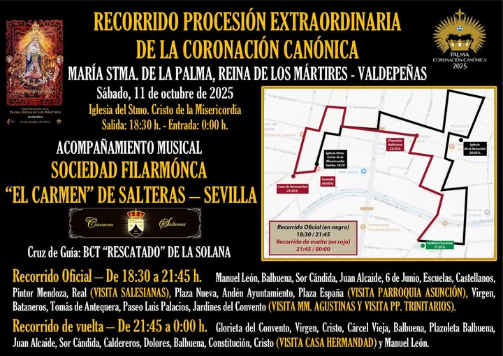 Estos son los horario y recorrido de la Procesión Extraordinaria de la Coronación Canónica de María Stma. de la Palma.