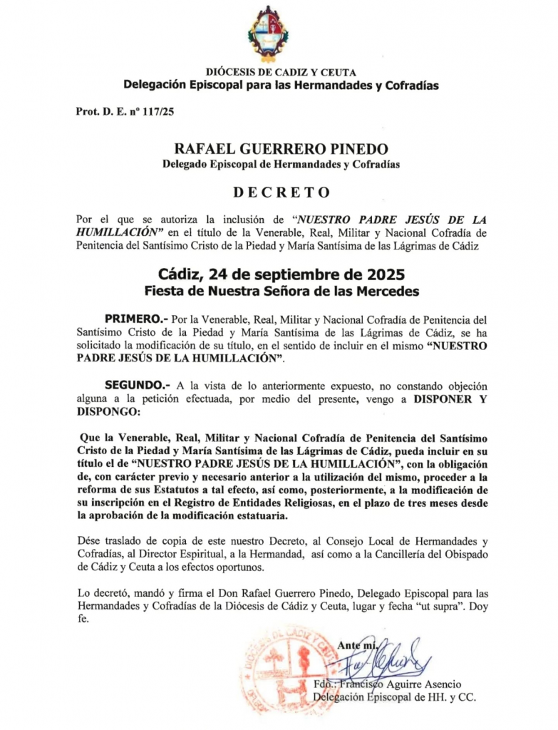 Uncategorized La Diócesis de Cádiz y Ceuta aprueba la inclusión en el Título de la Hermandad de la Piedad a Ntro. Padre Jesús de la Humillación admin septiembre 24, 2025 1 min de lectura El Nuestro Padre Jesús de la Humillación es una talla atribuida al taller de Pedro Roldán datada entre 1675 y 1680. Tags: CADIZ HERMANDAD DE LA PIEDAD JESUS DE LA HUMILLACION TITULO Post navigation Anterior Calendario de actos con motivo del XXV aniversario de Nuestro Padre Jesús de las Penas de AlmeríaSiguiente Lucena se prepara para celebrar el sábado Procesión Magna Deja una respuesta Cancelar la respuestaTu dirección de correo electrónico no será publicada. Los campos obligatorios están marcados con *Comentario * Nombre * Correo electrónico * Web Guarda mi nombre, correo electrónico y web en este navegador para la próxima vez que comente. Δ Más historias 1 min de lectura Uncategorized La procesión de la Virgen del Rosario tendrá lugar el próximo 11 de octubre octubre 7, 2025 admin 1 min de lectura Uncategorized La Salud del Santo Ángel celebrará su Rosario vespertino el próximo 15 de noviembre octubre 7, 2025 admin 1 min de lectura Uncategorized La Patrona de Cádiz procesiona en la jornada de hoy por las calles de la ciudad en procesión de alabanzas octubre 7, 2025 admin