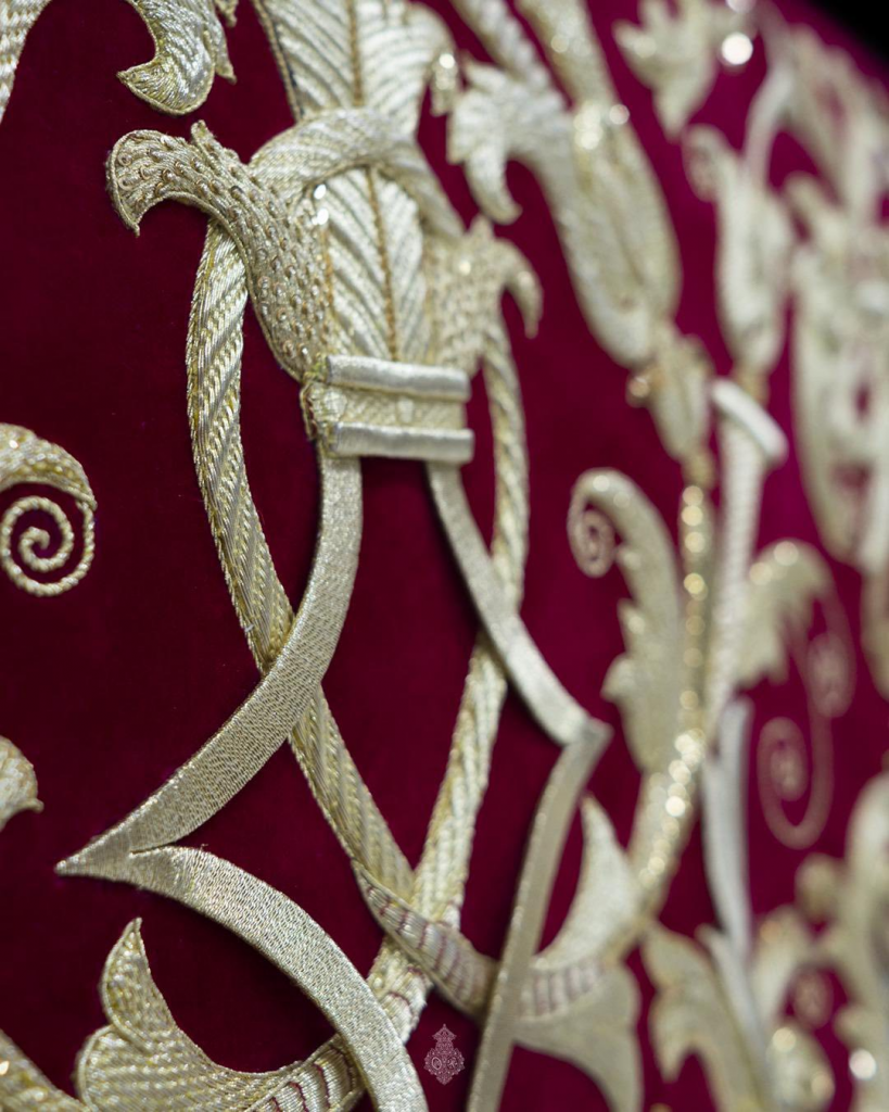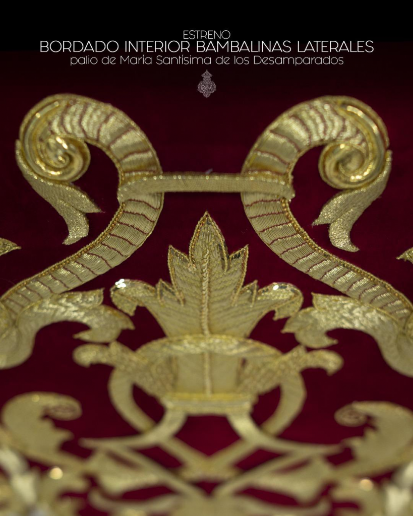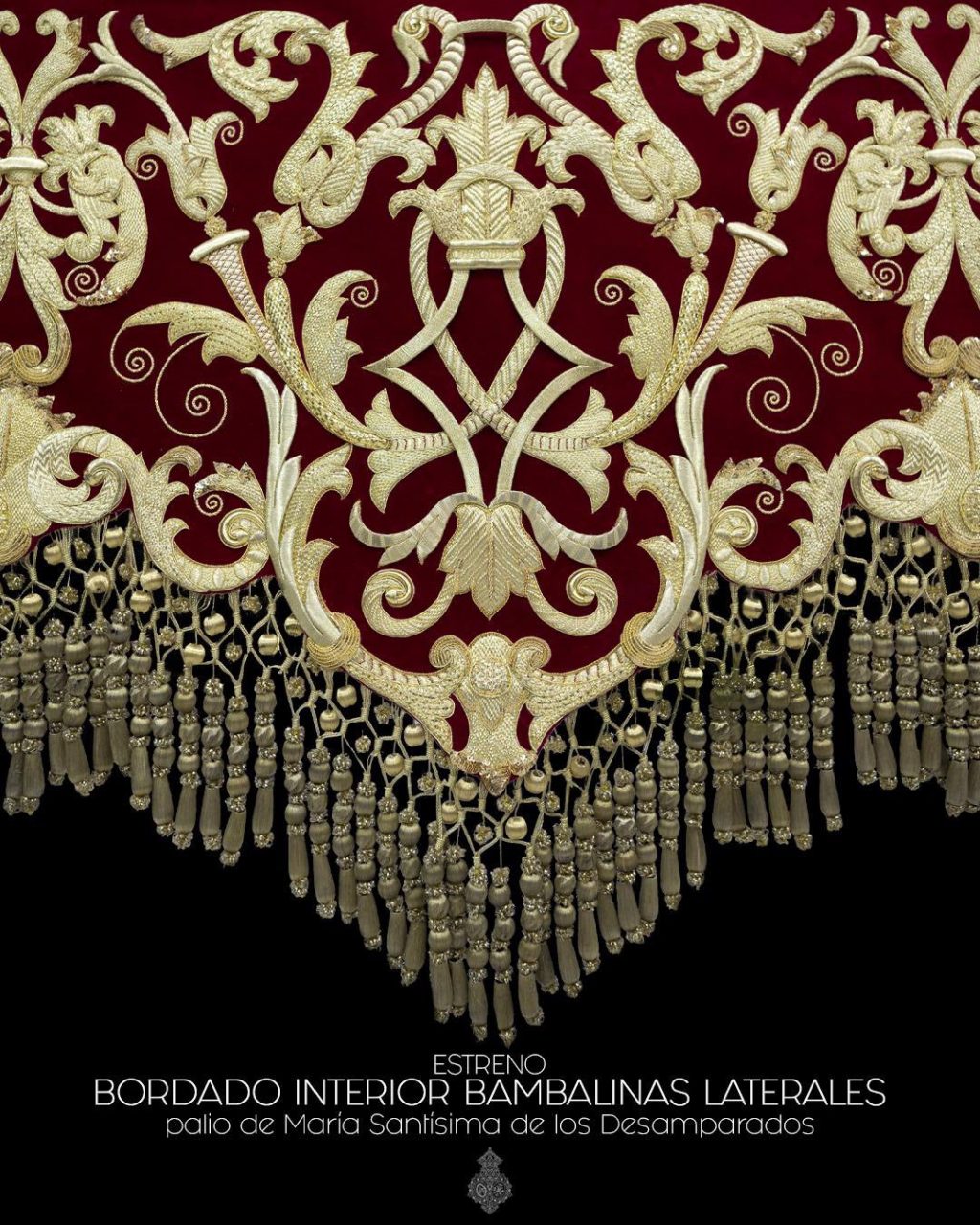 La Hermandad de Nuestro Padre Jesús de Salud y Pasión en su Tercera Caída y María Santísima de los Desamparados de la capital almeriense ha presentado el bordado interior de las bambalinas laterales del palio de María Stma de los Desamparados, realizadas por Manuel Solano Rodriguez bajo diseño de Orfebrería Ramón León.