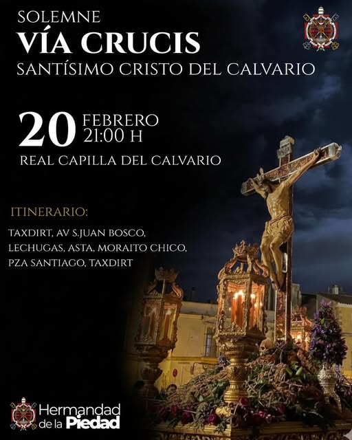 El recorrido previsto para este acto piadoso discurrirá por las calles Taxdirt, Avenida San Juan Bosco, Lechugas, Asta, Moraito Chico, Plaza de Santiago y regreso a Taxdirt, conformando un itinerario íntimo y profundamente arraigado en el barrio. La Hermandad anima a todos sus hermanos a vivir este momento con devoción y unidad, preparando así el corazón para la llegada de la Semana Santa y renovando el compromiso espiritual que cada año inspira la presencia del Santísimo Cristo del Calvario entre sus fieles.
