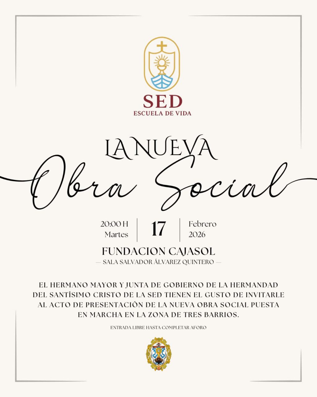 La Hermandad del Santísimo Cristo de la Sed de Sevilla presentará de forma oficial su nueva obra social, “SED Escuela de Vida”, un proyecto que nace con la vocación de convertirse en un faro de acompañamiento, formación y esperanza para quienes más lo necesitan.