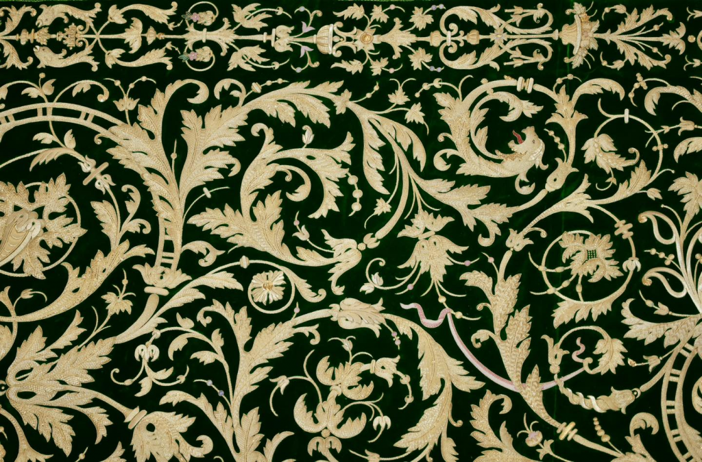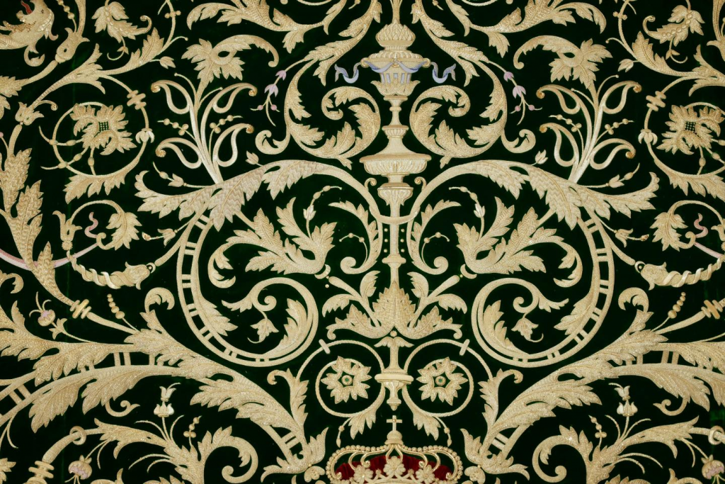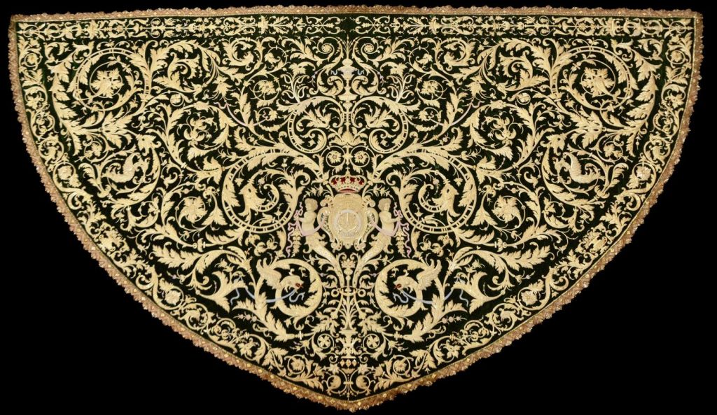 La obra incorpora un completo repertorio de técnicas de bordado en oro, con especial riqueza en cartulinas, hojillas, matizados en sedas o giraspes y grandes piezas de tejido que componen el conjunto.