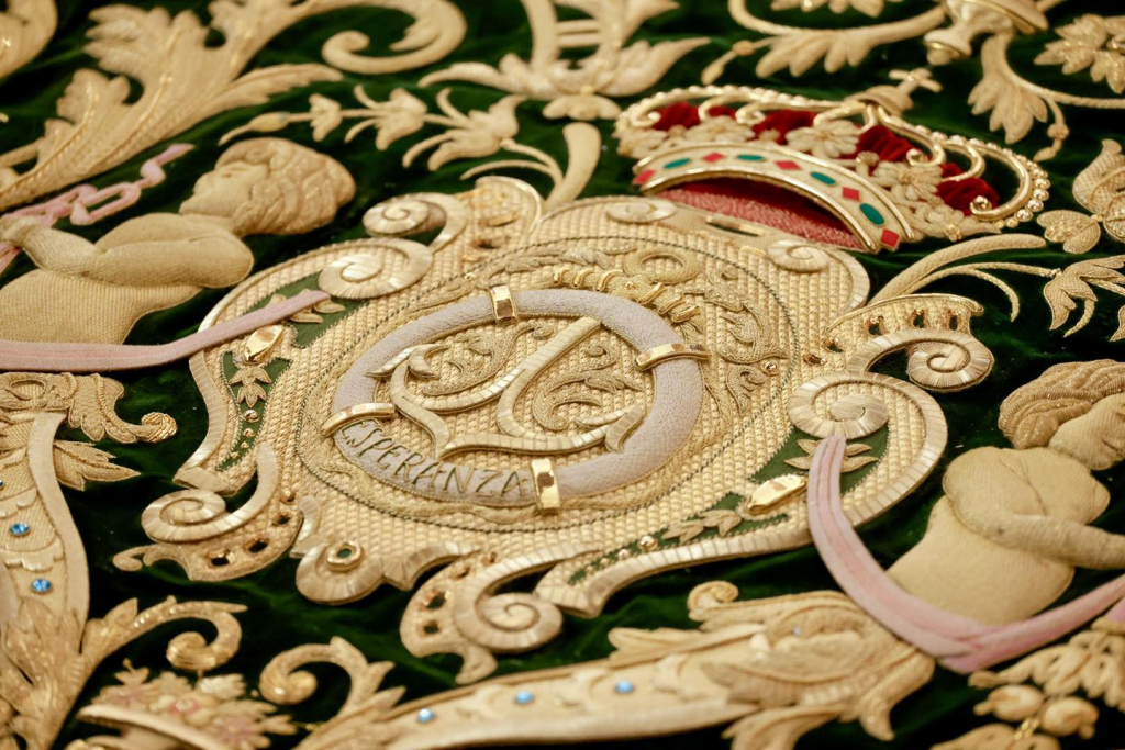 La Hermandad Sacramental de la Esperanza de Triana incorpora a su patrimonio un nuevo manto bordado para cultos, besamanos y traslados de Nuestra Señora de la Esperanza, realizado en terciopelo verde bordado en oro, ejecutado en el taller de Pepi Maya y diseñado por N.H.D. Francisco Javier Sánchez de los Reyes.