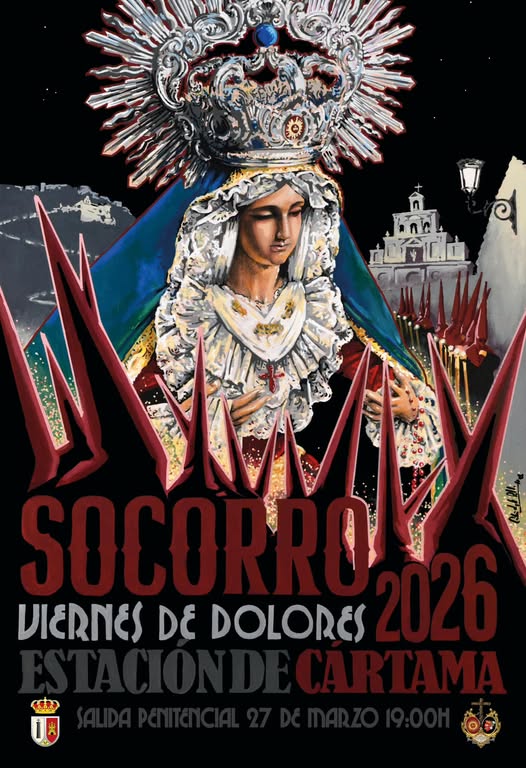 El cartel, concebido como anuncio oficial del Viernes de Dolores 2026, recoge en una sola imagen todo aquello que define al municipio y a su devoción. En primer plano aparece la Virgen del Socorro, representada con la delicadeza y fuerza expresiva que caracteriza a Cortés del Pueblo. A su alrededor, los nazarenos, símbolo vivo de la comunidad creyente, recordando que la hermandad es un pueblo entero que camina unido tras su titular.