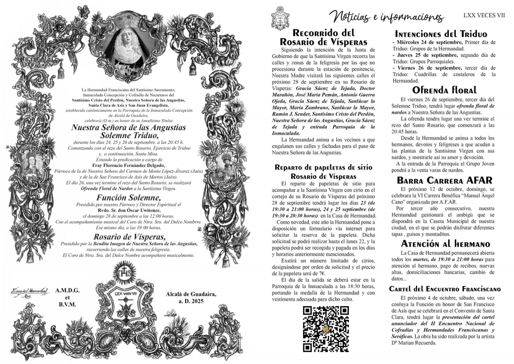 Este miércoles, dia 24 de septiembre de 2025, darán comienzo los tradicionales cultos de septiembre en honor de Nuestra Señora de las Angustia que organiza la Hermandad del Perdón de Alcalá de Guadaira e los que se celebrar un solemne Tricuo en honor a la Santísima Virgen y la Función Solemne