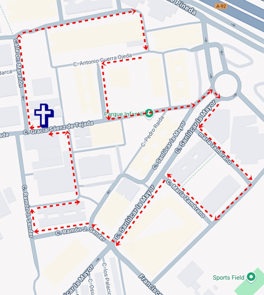 El itinerario que recorrerá seré el siguiente: Salida Parroquia de la Inmaculada Concepción, Gracia Sáenz de Tejada, Doctor Marañón, José María Pemán, Antonio Guerra Ojeda, Gracia Sáenz de Tejada, Sanlúcar la Mayor, María Zambrano, Sanlúcar la Mayor, Ramón J. Sender, Santísimo Cristo del Perdón, Nuestra Señora de las Angustias, Gracia Sáenz de Tejada y entrada Parroquia de la Inmaculada.