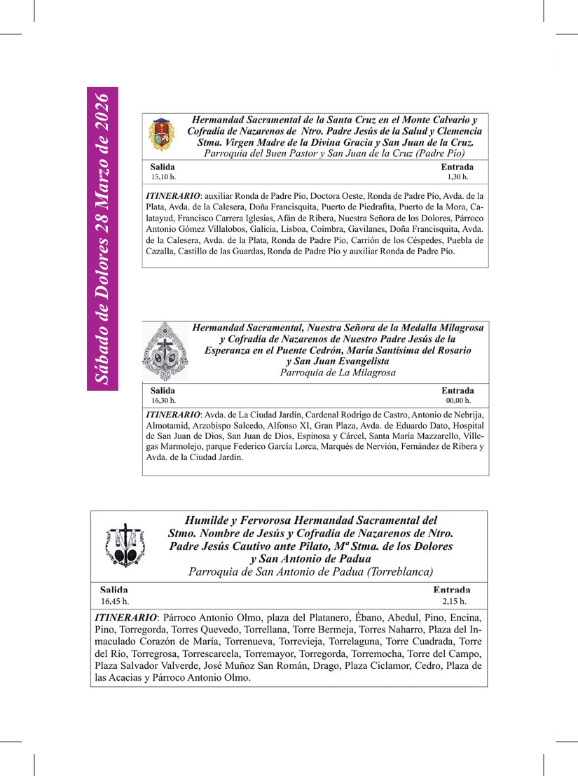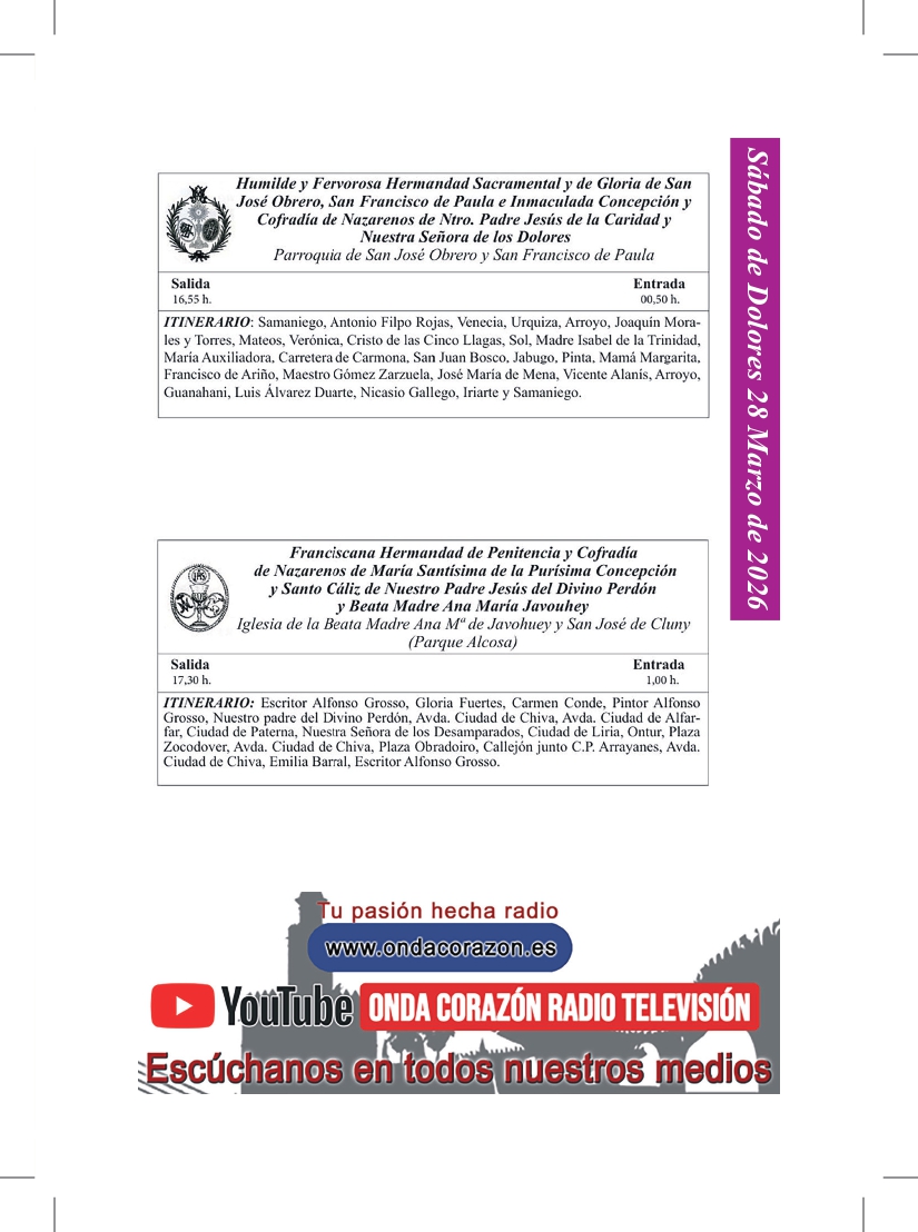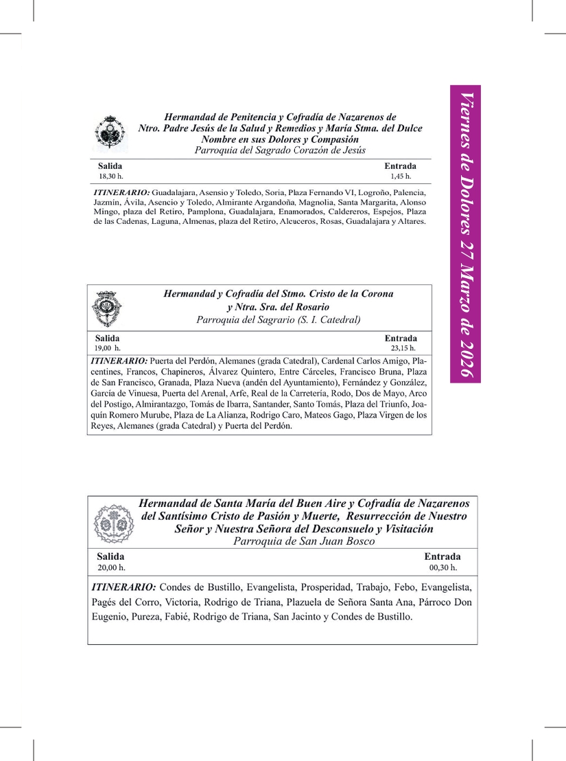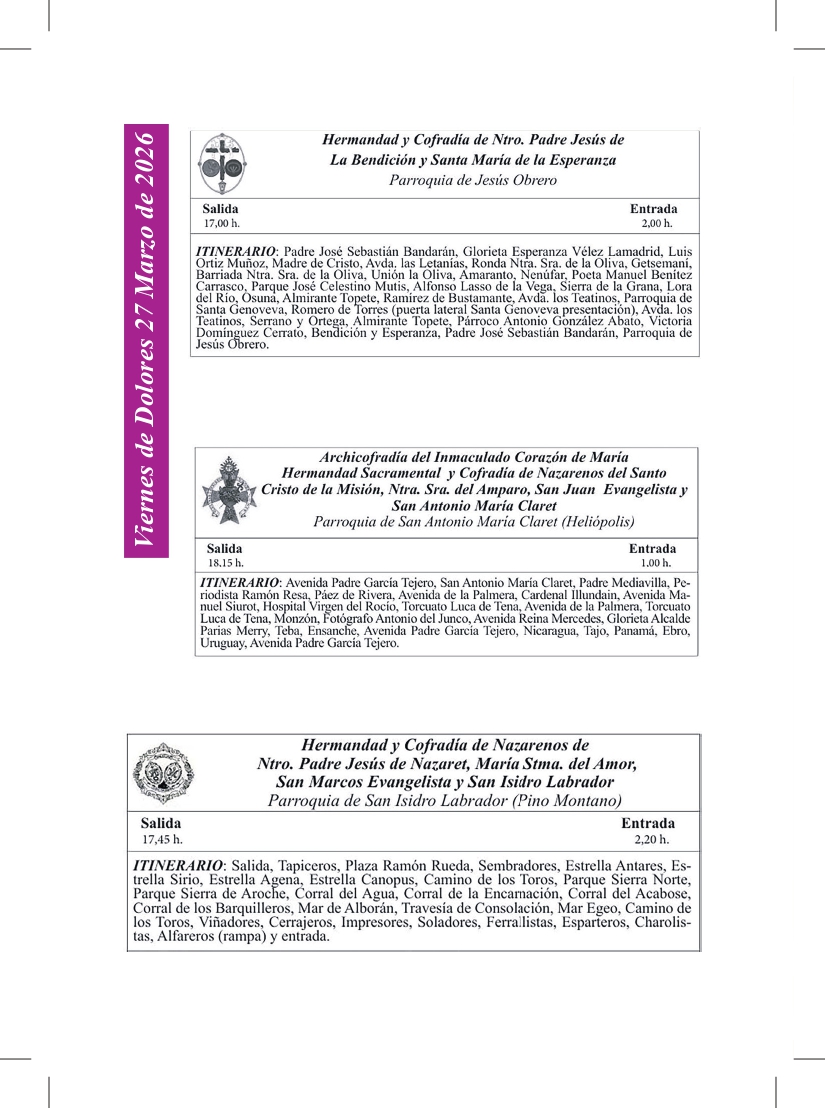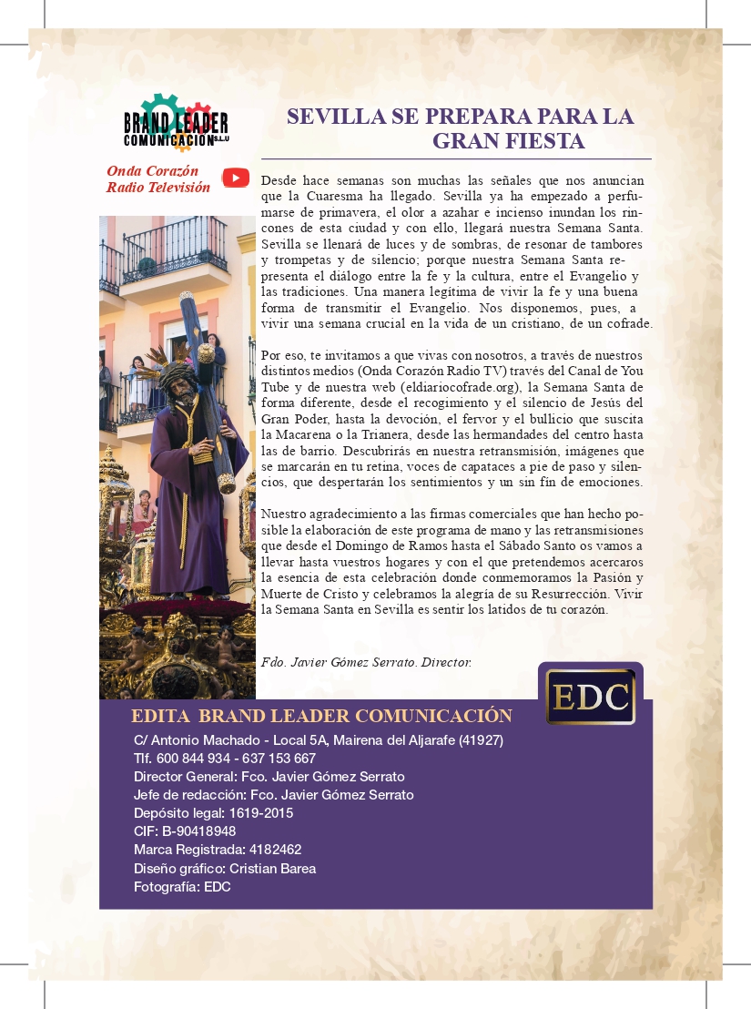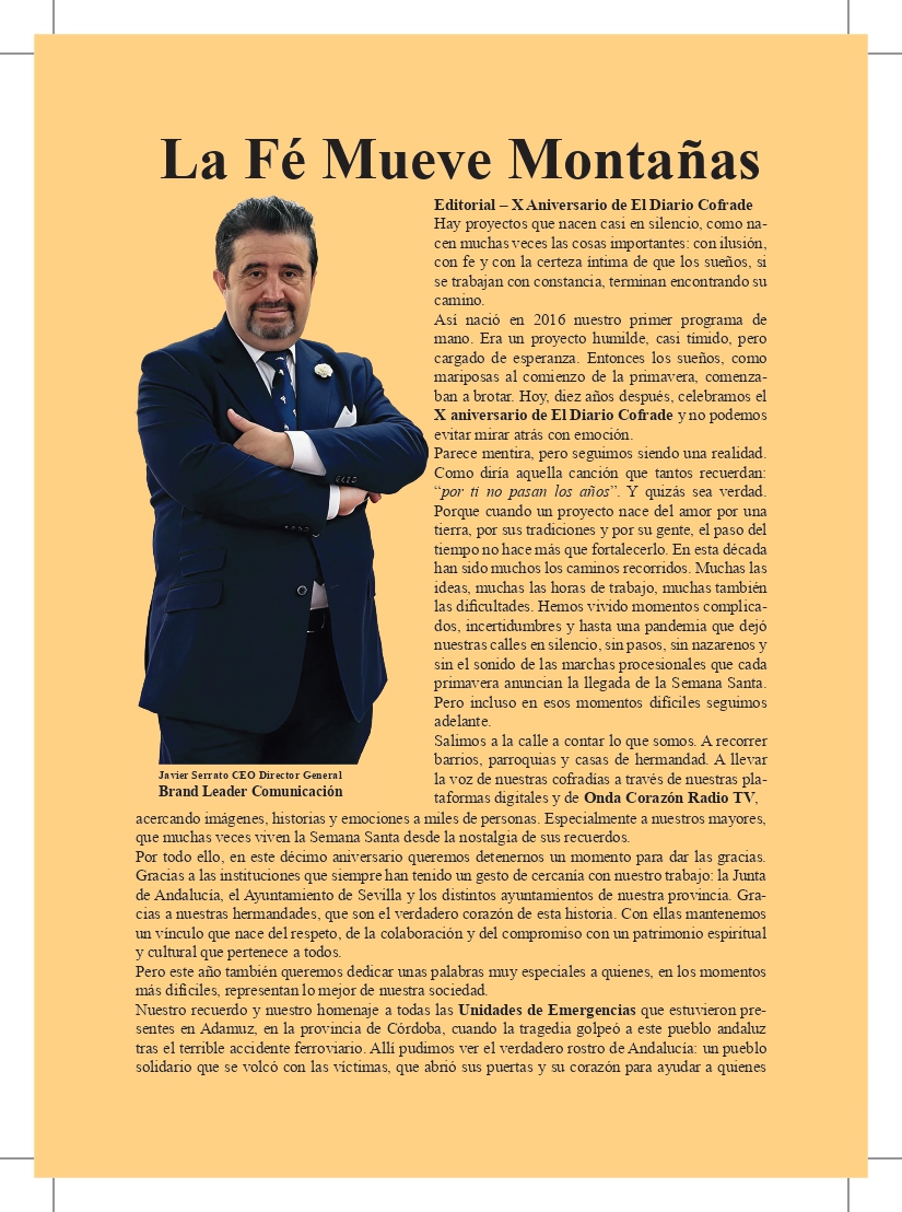Uncategorized Ya está en la calle el Programa de mano de papel de EL DIARIO COFRADE de la Semana Santa de Sevilla admin marzo 27, 2026 1 min de lectura Sevilla, a 27 de marzo de 2026 Tags: EL DIARIO COFRADE PROGRAMA DE MANO SEMANA SANTA SEVILLA Post navigation Anterior La Centuria Romana Macarena recorrerá Sevilla con su desfile tradicional del Jueves Santo Deja una respuesta Cancelar la respuestaTu dirección de correo electrónico no será publicada. Los campos obligatorios están marcados con *Comentario * Nombre * Correo electrónico * Web Guarda mi nombre, correo electrónico y web en este navegador para la próxima vez que comente. Δ Más historias 3 min de lectura GRANADA Uncategorized La Lanzada presenta la nueva bambalina frontal de la Virgen de la Caridad marzo 25, 2026 admin 2 min de lectura Uncategorized Comunicado de la Hermandad de San Bernardo ante el Miércoles Santo para evitar interrupciones en el discurrir de los pasos marzo 24, 2026 admin 2 min de lectura Uncategorized Nuevas incorporaciones al patrimonio de la Hermandad de San Pablo marzo 22, 2026 admin